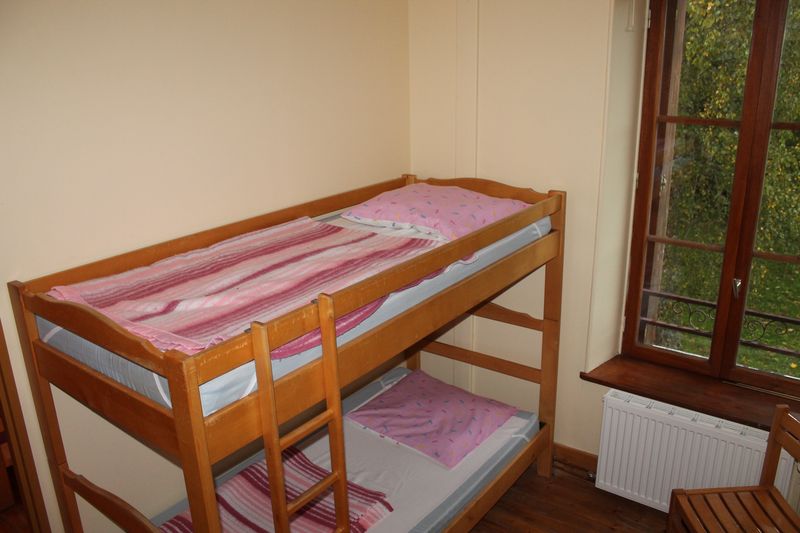 Une chambre de 7 personnes avec un lit double et dans la chambre attenante, 2 x 2 lits superposés et 1 lit simple, avec salle de bain et WC privatifs.