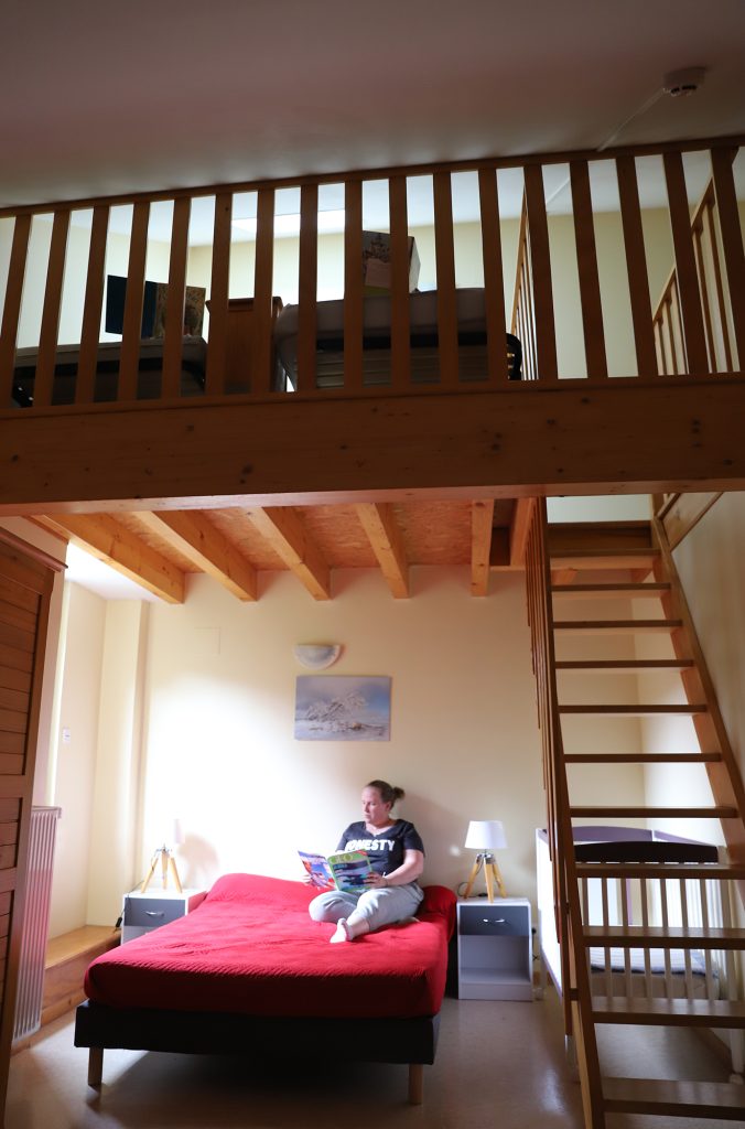 Une chambre de 6 personnes avec un lit double, 2 lits simples et 3 matelas dans une mezzanine, avec salle de bain et WC privatifs.