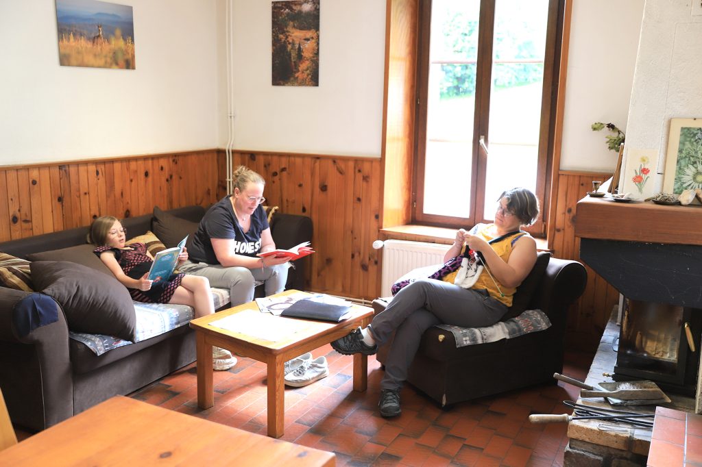 Une 1ère salle à manger meublée avec coin détente devant un feu à l’âtre et accès à la terrasse par la baie vitrée :