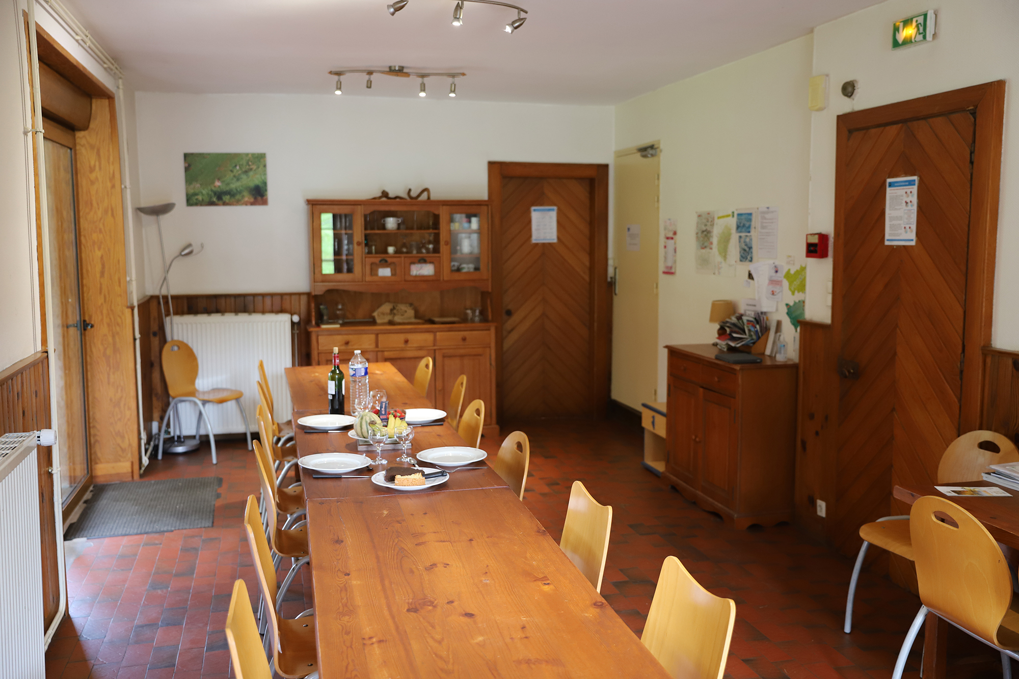 Une 1ère salle à manger meublée avec coin détente devant un feu à l’âtre et accès à la terrasse par la baie vitrée :